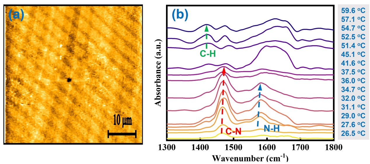 MAPbI3晶体的AFM形貌像(a)及其纳米尺度原位变温红外光谱(b)