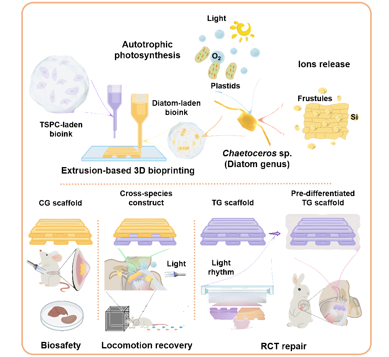 近日,中国科学院上海硅酸盐研究所吴成铁研究员带领研究团队在3D生物打印跨物种细胞共生支架用于肌腱-骨重建领域取得新进展。受到海洋藻类为各类生物和周围环境提供充足氧气及营养物质的启发,该研究团队提出通过跨物种共生实现海洋硅藻活体驯化哺乳动物细胞的理念。硅藻是一种特殊的近海藻类,具有功能性的硅质细胞壁和自发荧光的光合色素,能够持续释放活性硅离子,并通过光合作用产生氧气,为调节微环境、改善组织再生中细胞功能障碍提供了新思路。基于此,研究团队将硅藻与哺乳动物组织细胞结合,采用3D生物打印技术,设计了一种硅藻活体衍生的跨物种构建体,改善肌腱细胞微环境,促进肌腱-骨界面损伤修复(图1)。该研究成果以“Diatomaceous Cross-Species Constructs for Tendon-to-Bone Regeneration”为题,近日发表于国际知名期刊Materials Todayhttps://doi.org/10.1016/j.mattod.2024.12.010),并申请发明专利一项。论文第一作者为上海硅酸盐所博士生韩雅卉,通讯作者为吴成铁研究员。