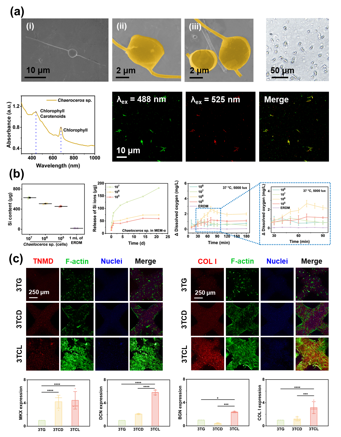 2. 角毛藻的表征和跨物种支架的成腱分化。(a)角毛藻的SEM图像、伪彩图像、明场图像、UV-vis光谱和自发荧光;(b)硅质壳中硅含量测量、硅离子释放和光合作用产生溶解氧含量;(c)跨物种支架的体外生物活性。