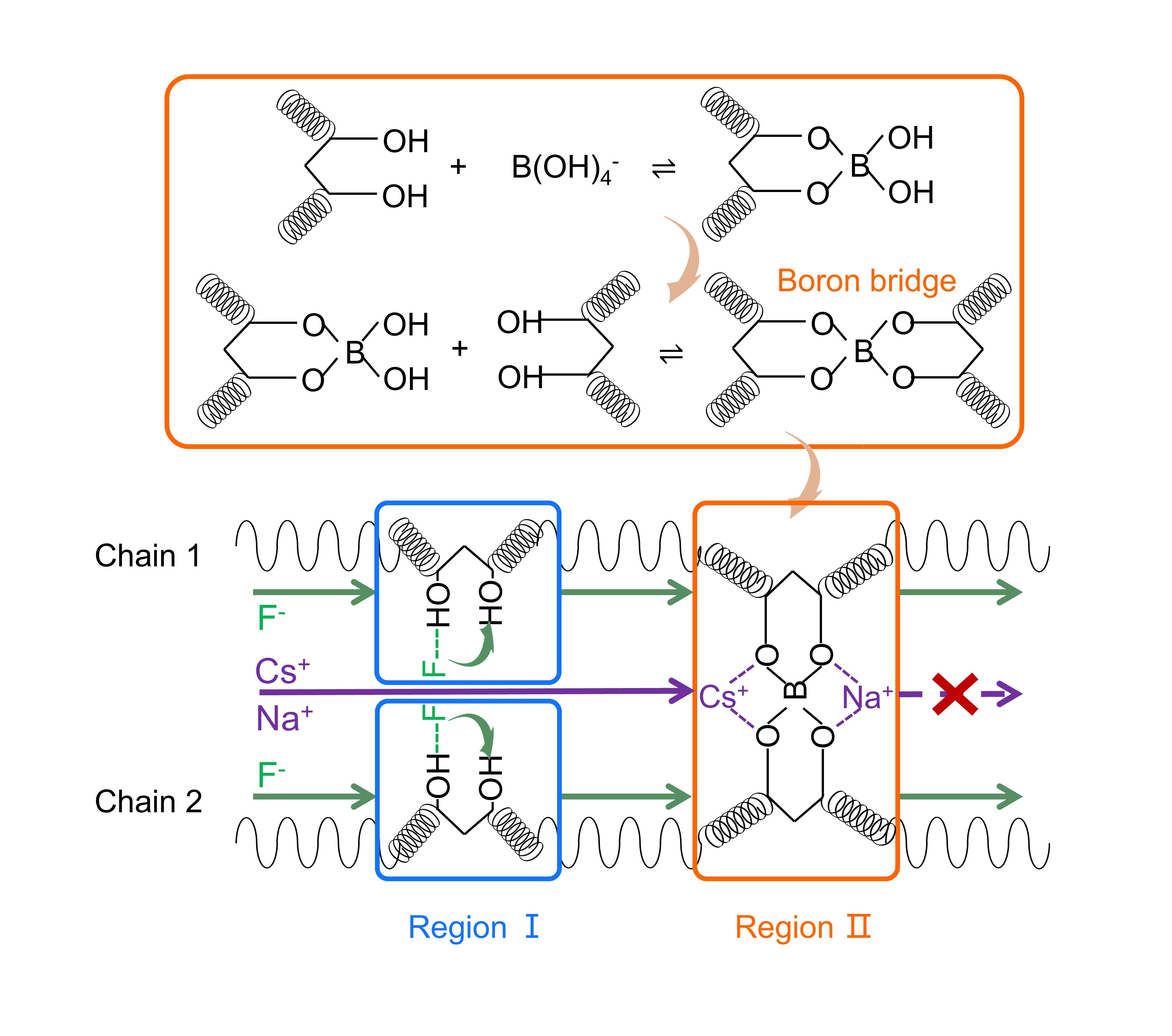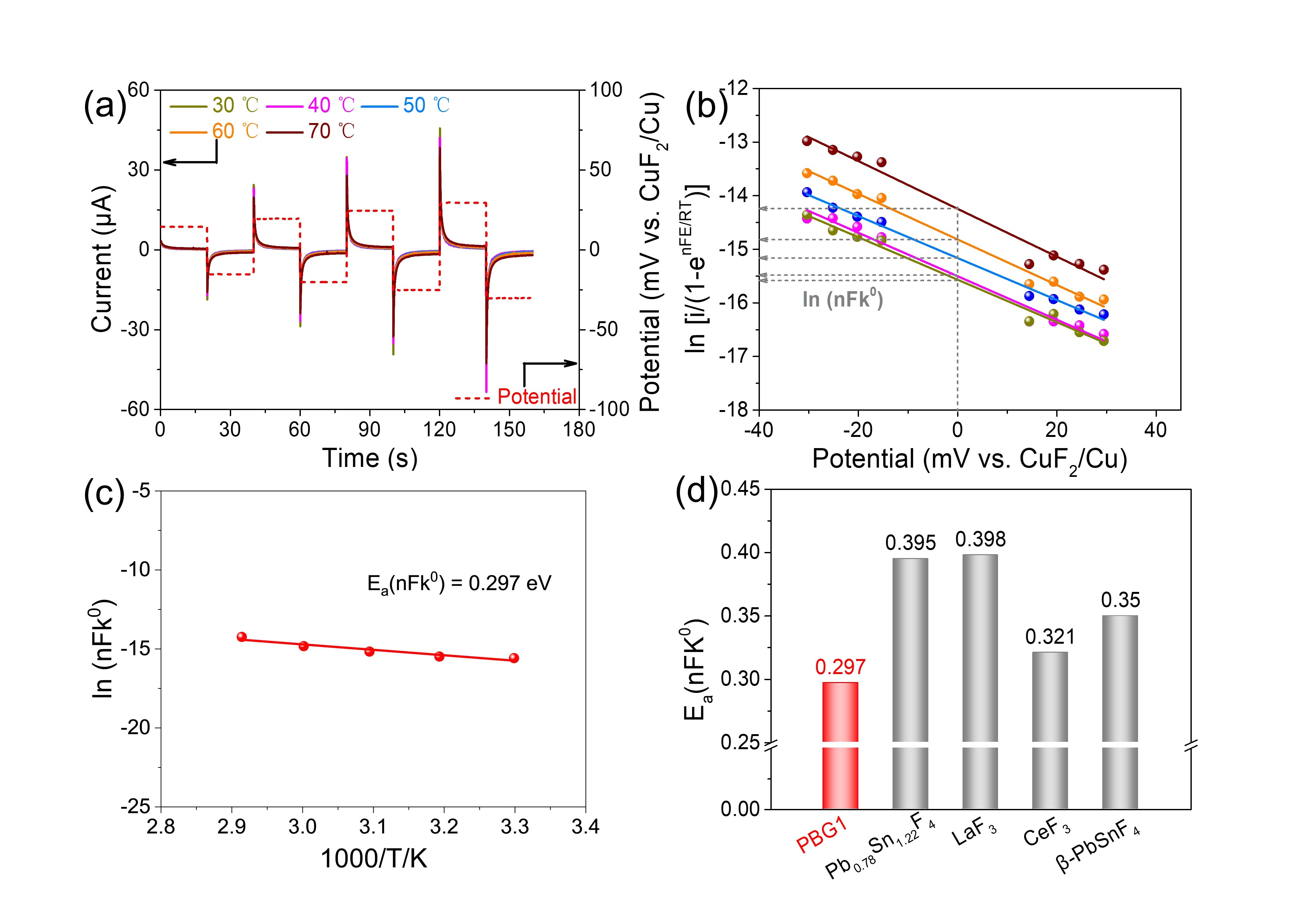 近日,中国科学院上海硅酸盐研究所李驰麟研究员团队首次提出聚合物型近室温全固态可充氟离子电池的构筑理念,开发了一种针对可充氟离子电池的聚乙烯醇-硼砂-甘油(PBG)基聚合物电解质。通过聚乙烯醇(PVA)链上F-和-OH之间的氢键作用可实现氟盐的解离以及F-沿PVA链的传输。而从硼砂中解离的B(OH)4-可以用作交联剂,通过与PVA上的羟基反应脱水形成具有3D交联结构的聚合物。PVA基膜通常表现出高结晶度和高熔点,导致机械性能和界面接触欠佳,而合成过程中加入甘油,可以通过硼介导的交联与聚合物链强烈相互作用,可以显著消除PVA的结晶微区,提高聚合物的低温抗冻性和机械性能。与硼砂交联后,路易斯碱性硼酸酯位点能够通过离子-偶极相互作用抑制阳离子穿梭和活性材料在电解质中的溶解。
