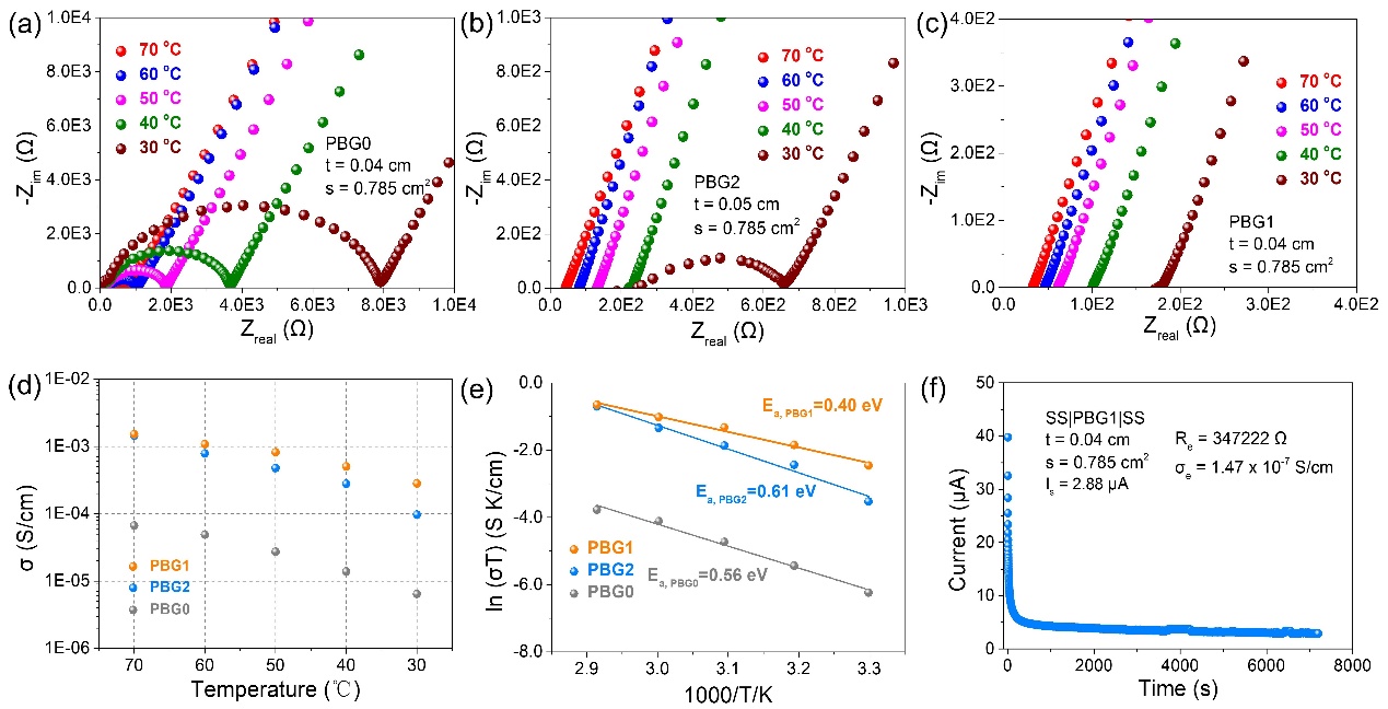 得到的PBG电解质的离子电导率在30°C时为2.82×10-4 S cm-1,在60°C时高达1.08×10-3 S cm-1(接近液态电解质水平)。此外,PBG电解质的平坦柔软表面能够与正极进行更充分的接触,可以显著降低电极/电解质界面传输过程的活化能。得益于高离子电导率和更容易的界面传输,即使在没有界面润湿剂和额外离子导电网络以及纯金属箔作为负极的条件下,基于PBG聚合物电解质的全固态FIBs的初始放电容量在25 mA g-1时高达209.7 mAh g-l,可逆容量保持在141.3 mAh g-l,能够在125 mA g-1的高电流密度下进行可逆循环,并保持稳定的库仑效率(~100%)。这项工作为安全可靠且柔性的FIBs设计提供了一种全新的解决方案。