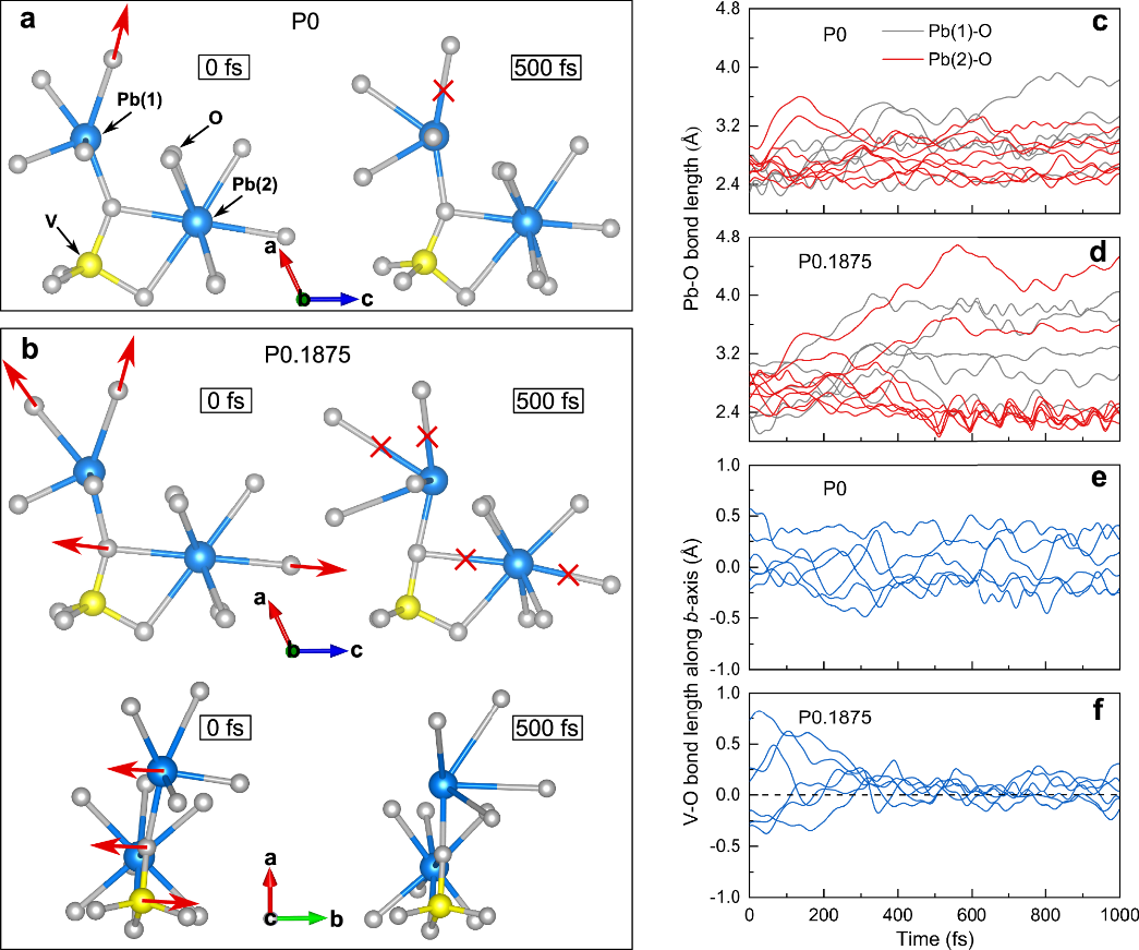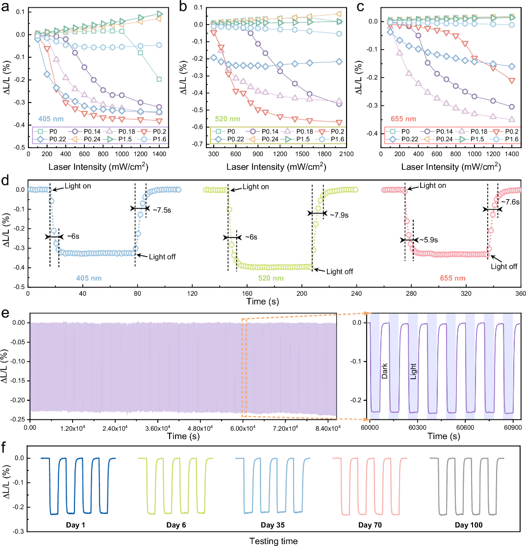 实验表明,随着P含量增加,材料从室温单斜晶相(β相)向高温菱方晶相(γ相)的转变温度逐渐降低至接近室温,形成多晶型相界PPB。在该区域内,β相与γ相共存,材料相组分对外界光刺激极为敏感。PPB区域的样品在405、520和655nm波长光照下均表现出显著的光致收缩行为,其中P掺杂量为0.22的样品在405纳米激光照射下光致伸缩效率达到1.75×10⁻¹⁰ m³/W,较未掺杂样品提升近两个数量级。此外,研究还结合原位XRD和拉曼光谱揭示了光致相变的动态过程:低光强即可触发β相向γ相的转变,且相变比例随光强增加呈饱和趋势,与理论计算预测结果高度吻合。此外,密度泛函理论(DFT)和分子动力学模拟表明,磷掺杂通过降低β相与γ相的能量差,促进了光激发下Pb-O-V链的共线排列和V-V二聚体的形成,从而驱动晶格结构的快速重构。Pb3V2-xPxO8陶瓷这种兼具高应变和高效率的特性,标志着无机光致伸缩材料向实用化迈出关键一步,为开发微型光驱动执行器、光声器件等 MEMS 设备提供了理想材料体系。