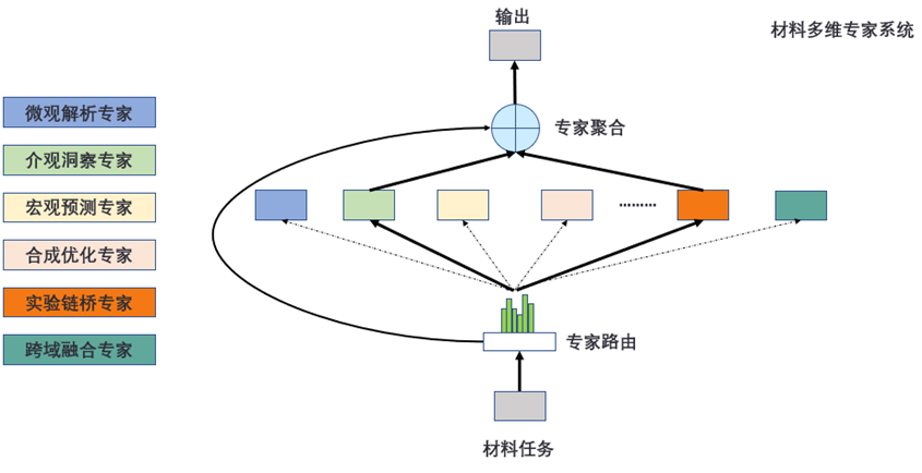 图2展示了一个多维专家系统,通过聚合来自不同领域的专家模块,协同解决材料研发中的复杂问题。