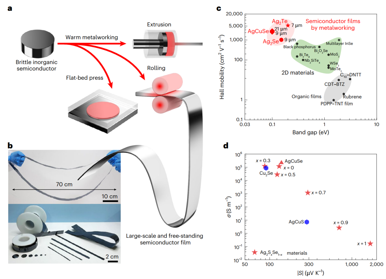 温度是诱导塑性形变的一个重要因素,绝大部分材料在高温下更易塑性成型。然而,绝大多数半导体和陶瓷等无机非金属材料的“韧脆转变温度”过高(约熔点的0.5-0.7倍,500-700℃以上),热加工难度大、成本高。研究发现,一系列典型的窄禁带无机半导体(如Cu2Se、Ag2Se、Bi90Sb10)可在略高于室温的条件下(400-500 K)进行辊压轧制、平板压、挤压等塑性“温加工”(图1)。例如在420 K下辊轧得到的Ag2Se条带可达0.9米长,对应轧制延伸率高达3000%。此外,这些塑性加工后的材料保留了块体优良的物理性能。例如,厚度仅为数微米的Ag2Se、Ag2Te、AgCuSe等辊压膜的迁移率高达1000-5000 cm2/Vs,显著高于多数二维材料和有机薄膜。因此,与溅射、蒸发和化学气相沉积等无机半导体经典制备技术相比,塑性温加工方法在制造高质量半导体膜方面具有以下显著优势:(1)避免了衬底带来的各种限制和额外成本;(2)在微米至毫米范围内自由调控薄膜厚度;(3)薄膜结晶性好、元素分布均匀,很好地继承了块体材料优异可调的物理性能。