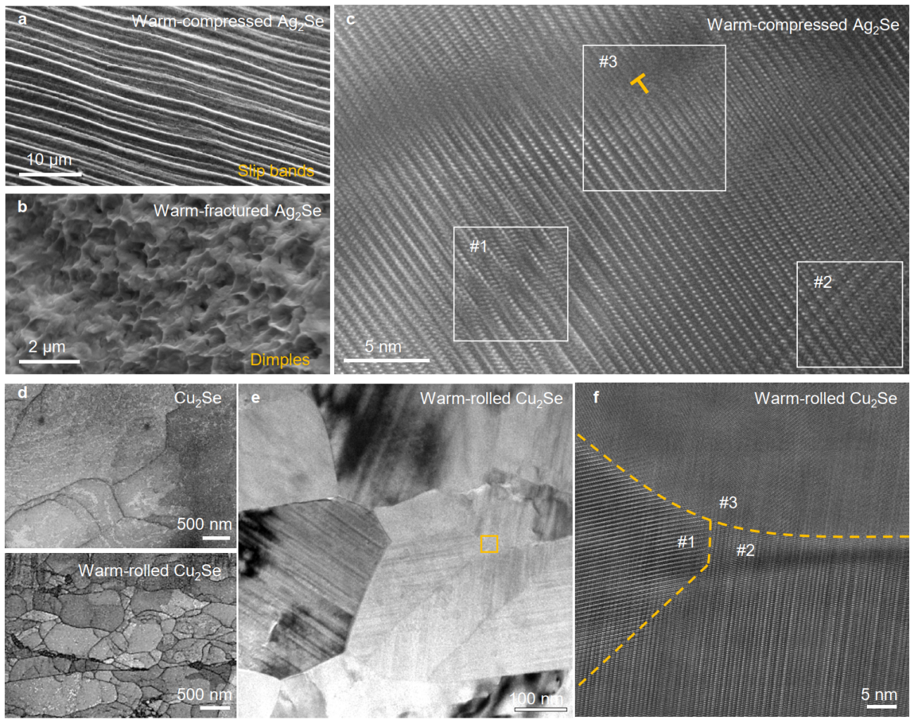 图2. Ag2Se和Cu2Se塑性温压缩及辊压后的微观组织结构。