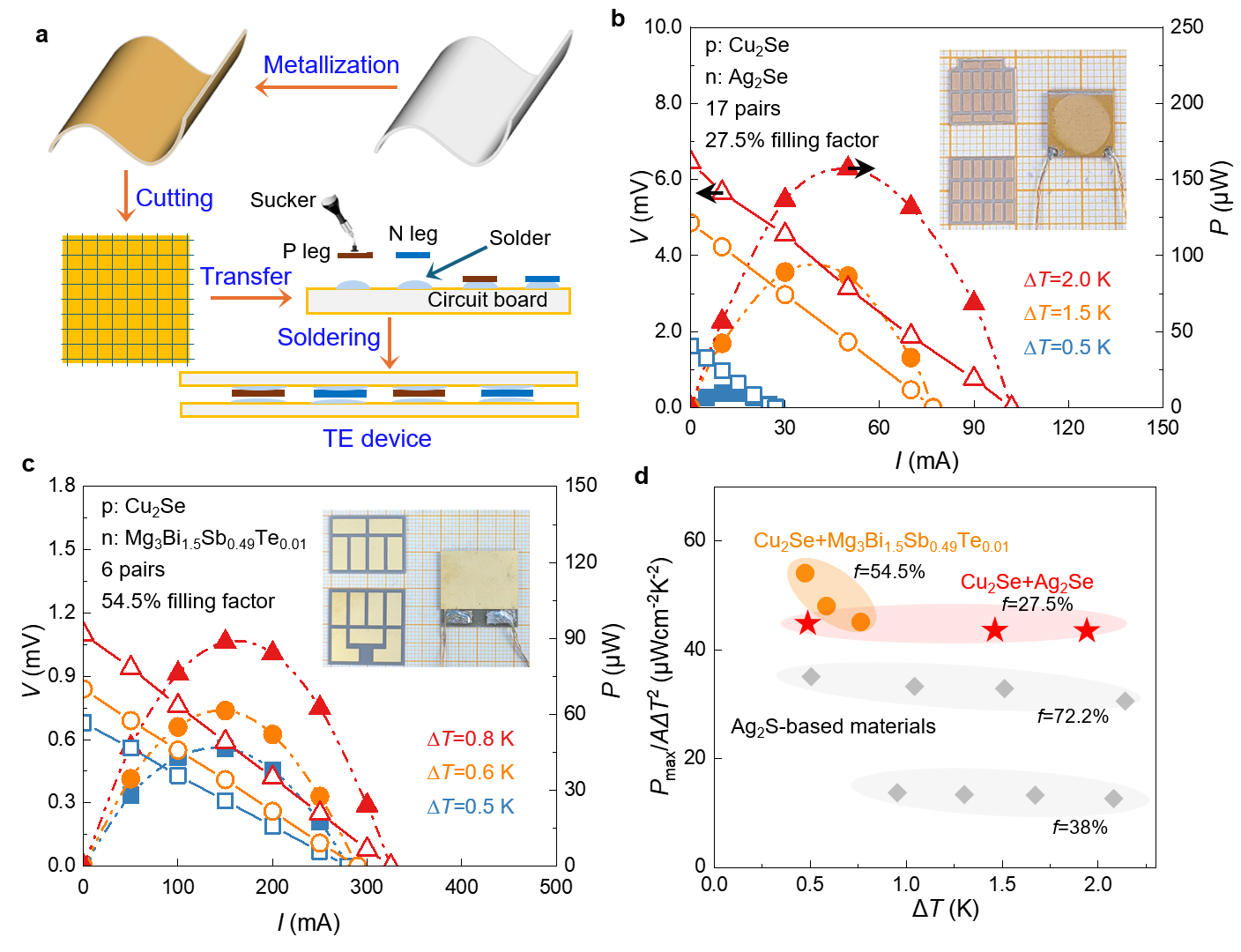 塑性温加工方法获得的高性能自支撑半导体在电子和能源器件方面有着广阔的应用前景。以热电能量转换为例,该工作选取了其中三种高性能热电材料的辊压薄片(厚度约100微米):Cu2Se、Ag2Se、Mg3Bi1.5Sb0.49Te0.01。采用表面喷砂粗化和磁控溅射工艺在薄片上下表面构筑功能化金属层,之后经过热电臂切割、转移和一体化集成焊接等工艺,研制了两种面外型薄膜热电器件,其中器件1#由17对p-Cu2Se与n-Ag2Se组成,填充率27.5%;器件2#由6对p-Cu2Se与n-Mg3Bi1.5Sb0.49Te0.01器件组成,填充率54.5%(图4)。得益于热电薄片的高功率因子以及热电臂-电极间的高强低阻界面,两种器件的最大归一化功率密度达到43-54 µW cm-2 K-2,约为先前报道Ag2S基薄膜热电器件的2倍。