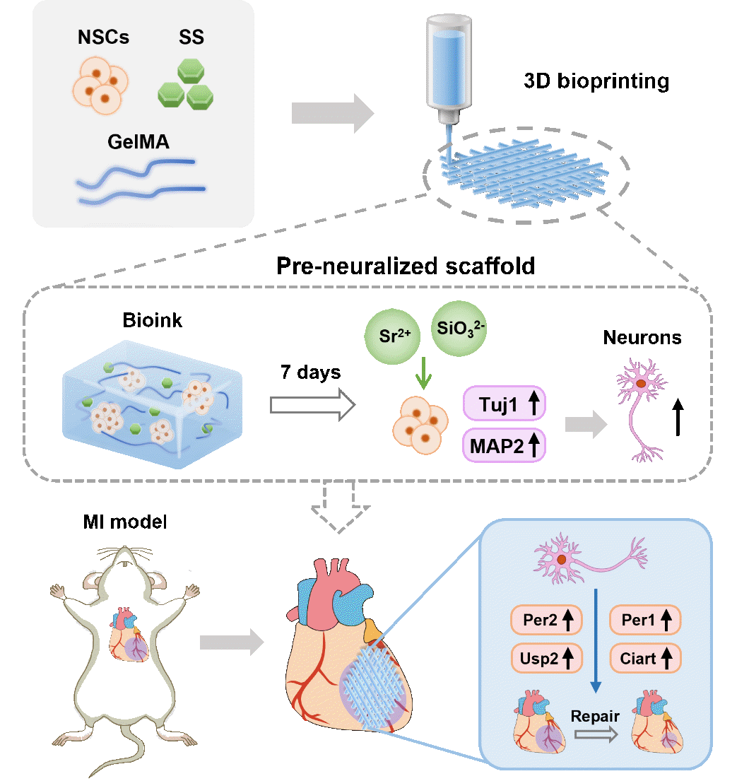 图1. 预神经化支架及其应用于心肌梗死修复的示意图。生物3D打印支架中的神经干细胞通过硅酸锶诱导分化为成熟的神经元。在植入心肌梗死大鼠体内后,预神经化支架通过调节与心肌保护相关的昼夜节律基因加速梗死心肌修复。