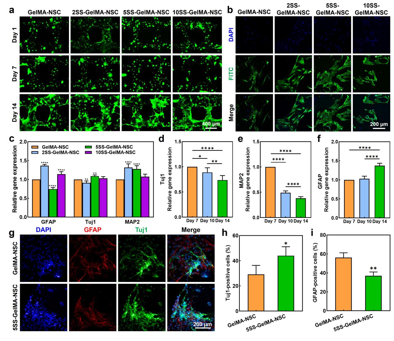 图2. 硅酸锶诱导神经干细胞支架的神经元分化行为。a)活/死染色图像。b)神经干细胞在支架内的铺展形态。c)支架内神经干细胞的神经元分化相关基因表达。d-f)培养不同天数的5SS-GelMA-NSC支架内神经干细胞的基因表达。g-i)GelMA-NSC和5SS-GelMA-NCS支架内神经干细胞的不同分化方向特异性蛋白的免疫荧光染色及阳性细胞统计数据。