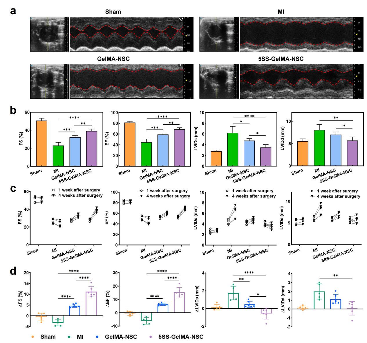 图3. 植入支架后大鼠的心脏功能恢复情况。a)植入4周后左心室超声心动图。b)植入4周后FS(缩短分数)、EF(射血分数)、LVID(收缩末期左心室内径)和LVIDd(舒张末期左心室内径)的统计分析。c)植入1周和植入4周FS、EF、LVIDs和LVIDd的比较。d)EF、FS、LVIDs和LVIDd从1周到4周的变化。