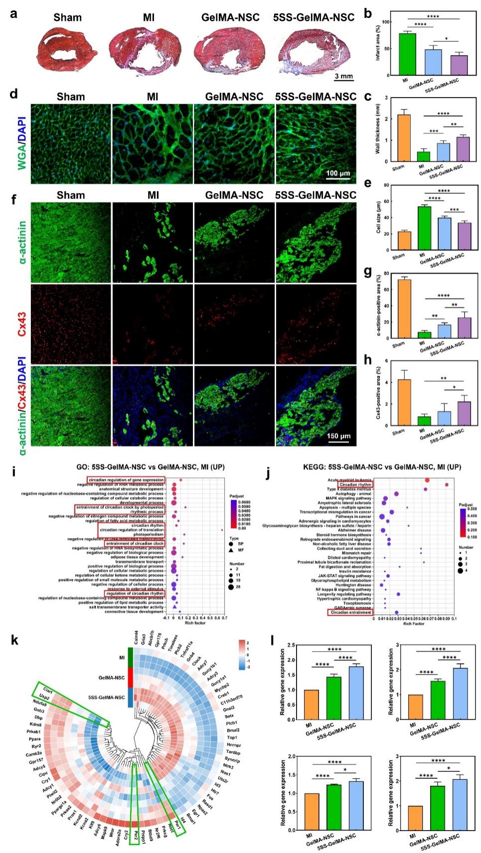 图4. 植入支架后第4周大鼠心脏梗死区的表征。a)大鼠心脏切片的Masson染色。b-c)心脏梗死面积和左心室壁厚度的统计分析。d)左心室心肌WGA染色图像。e)心肌细胞尺寸的统计分析。f)左心室心肌组织α-actinin和Cx43蛋白免疫荧光染色。g-h)α-actinin和Cx43阳性面积比例。i-j) 植入预神经化支架后上调差异表达基因GO和KEGG分析,红框所示为昼夜节律相关条目。k)昼夜节律相关差异表达基因的圆圈热图,绿框所示为与心肌保护有关的关键昼夜节律基因。l)四个心肌保护相关昼夜节律基因的RT-qPCR检测验证。