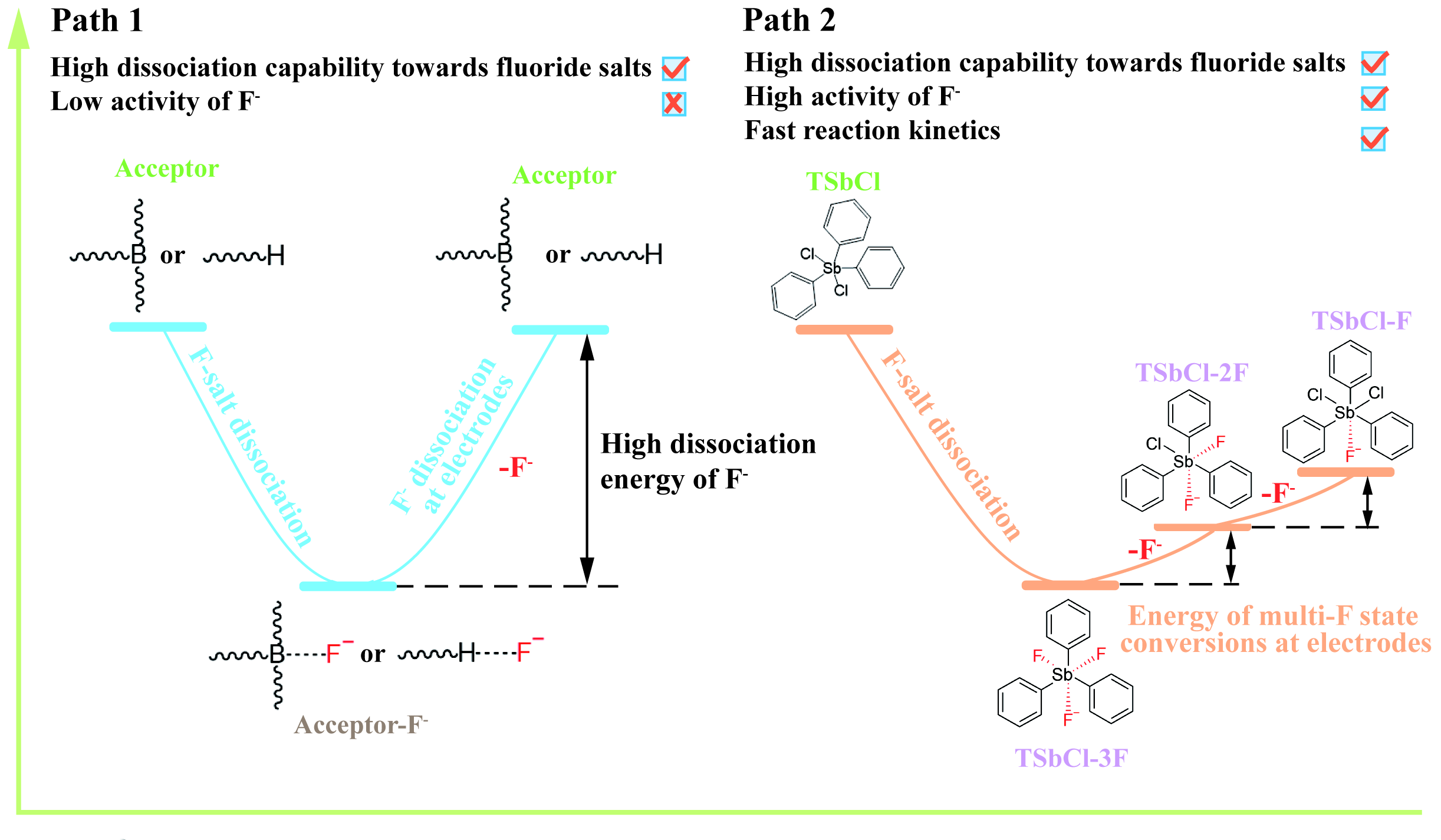 氟是元素周期表中电负性最强的元素和原子量最轻的卤素。与正电离子相比,低电荷密度F-具有高氧化稳定性、高迁移效率和低去溶剂化能垒。而氟离子电池以其理论能量密度高、无枝晶安全性、氟储量丰富等优势,有望在未来成为下一代二次电池。电解液作为F-传输的有效载体,对室温可逆氟离子电池的构建起着关键作用。然而,即使与大离子半径Cs+搭配,由于F-的强电负性,无机氟盐在传统有机溶剂中的溶解仍然具有挑战性。相比之下,高分子氟盐易于溶解但合成过程复杂,并且其𝛽-H易受霍夫曼消除反应的影响而导致持续的氟盐分解。尽管已经提出了多种阴离子受体来解决无机氟盐在有机溶剂中的不溶性问题,但氟离子从受体中解离的困难导致氟离子电池的寿命短且比容量低。