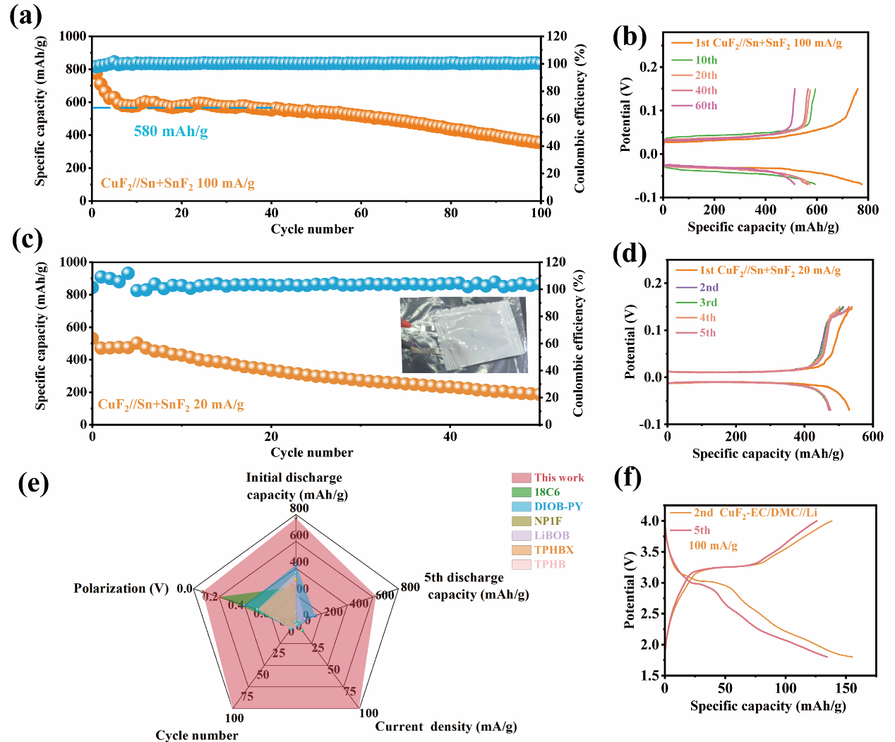 基于上述问题,中国科学院上海硅酸盐研究所李驰麟研究员带领的团队首次提出了一种受体-多氟态电解液体系,展示了一种具有超长寿命和超高比容量的氟离子电池。该电解液使用三苯基二氯化锑(简称TSbCl)作为新型阴离子受体,其高路易斯酸性促进了氟化铯(CsF)氟盐的完全解离。当TSbCl与氟离子结合形成六配位锑化合物(TSbCl-F)后,TSbCl上的氯位点可以进一步被氟取代,形成多氟受体态(TSbCl-nF,n = 2,3)。TSbCl-nF与TSbCl-(n-1)F之间的转化能量显著低于经典的单氟受体态(acceptor-F)向受体态(acceptor)转化的能量,从而促进了氟离子从阴离子受体-氟离子复合物中的解离。该策略结合了氟盐的高解离能力和电极-电解质界面释放氟离子的低热力学障碍,极低的热力学界面阻力导致铜基充电产物以更高氧化态(+2.5)出现,从而提升了氟离子电池的比容量。这种电解质设计使得氟离子电池具有持久的可逆氟化/脱氟反应(CuF2//Pb电池超过3700次循环,库仑效率高达99.5%,电压极化仅为30 mV)和超高可逆容量(CuF2//Sn+SnF2电池在100 mA/g下循环40次后容量为580 mAh/g)。此外,该工作还实现了高输出电压的氟离子电池(CuF2//Li电池放电平台为2.9 V)和更大尺寸的软包电池(可逆容量为530 mAh/g)。相关成果以“Construction of acceptor-multi-F state electrolyte to enable unprecedented long-life and high-capacity fluoride-ion batteries” 为题发表于Adv. Mater. 37, 2415106, 2025。