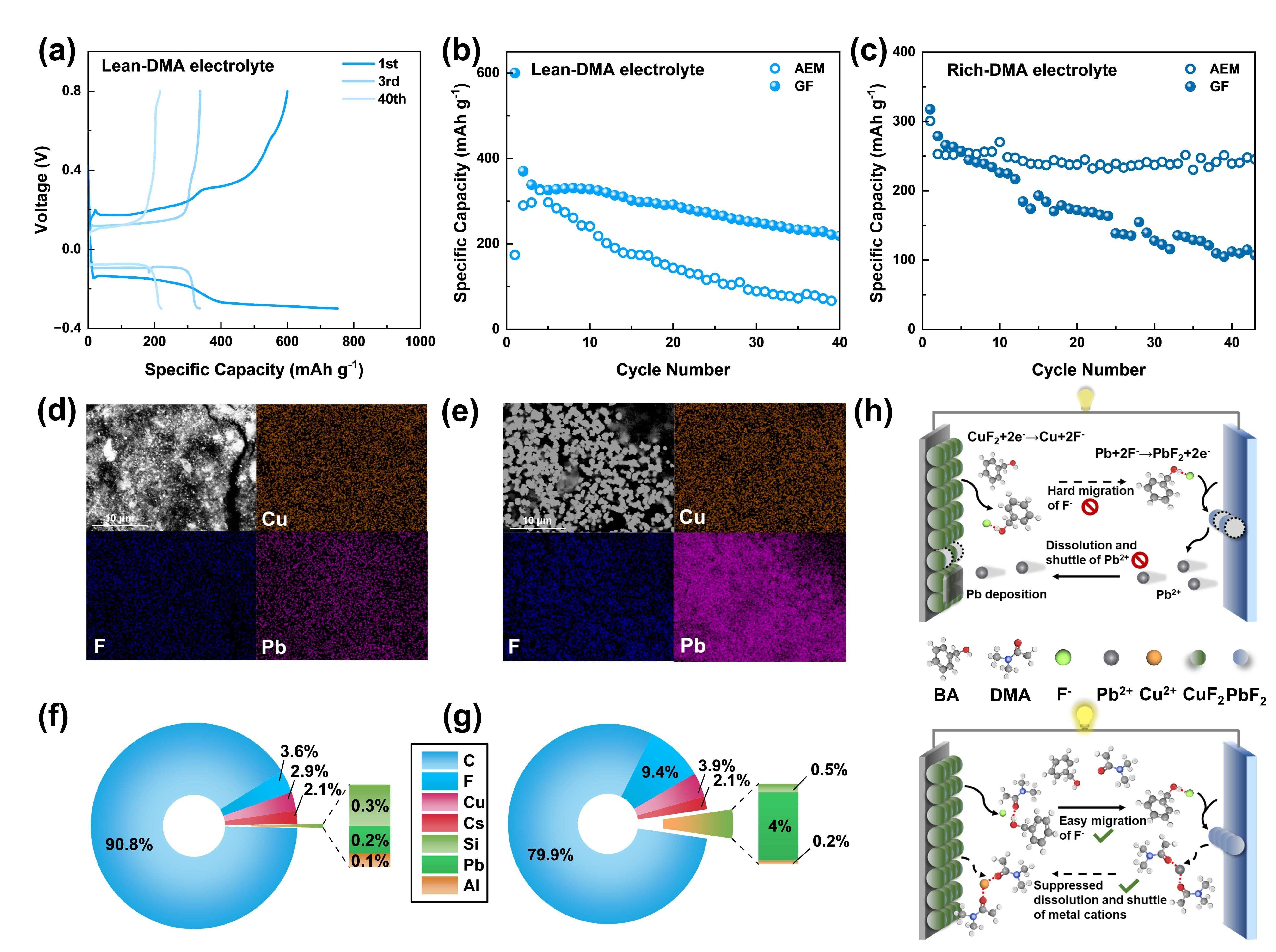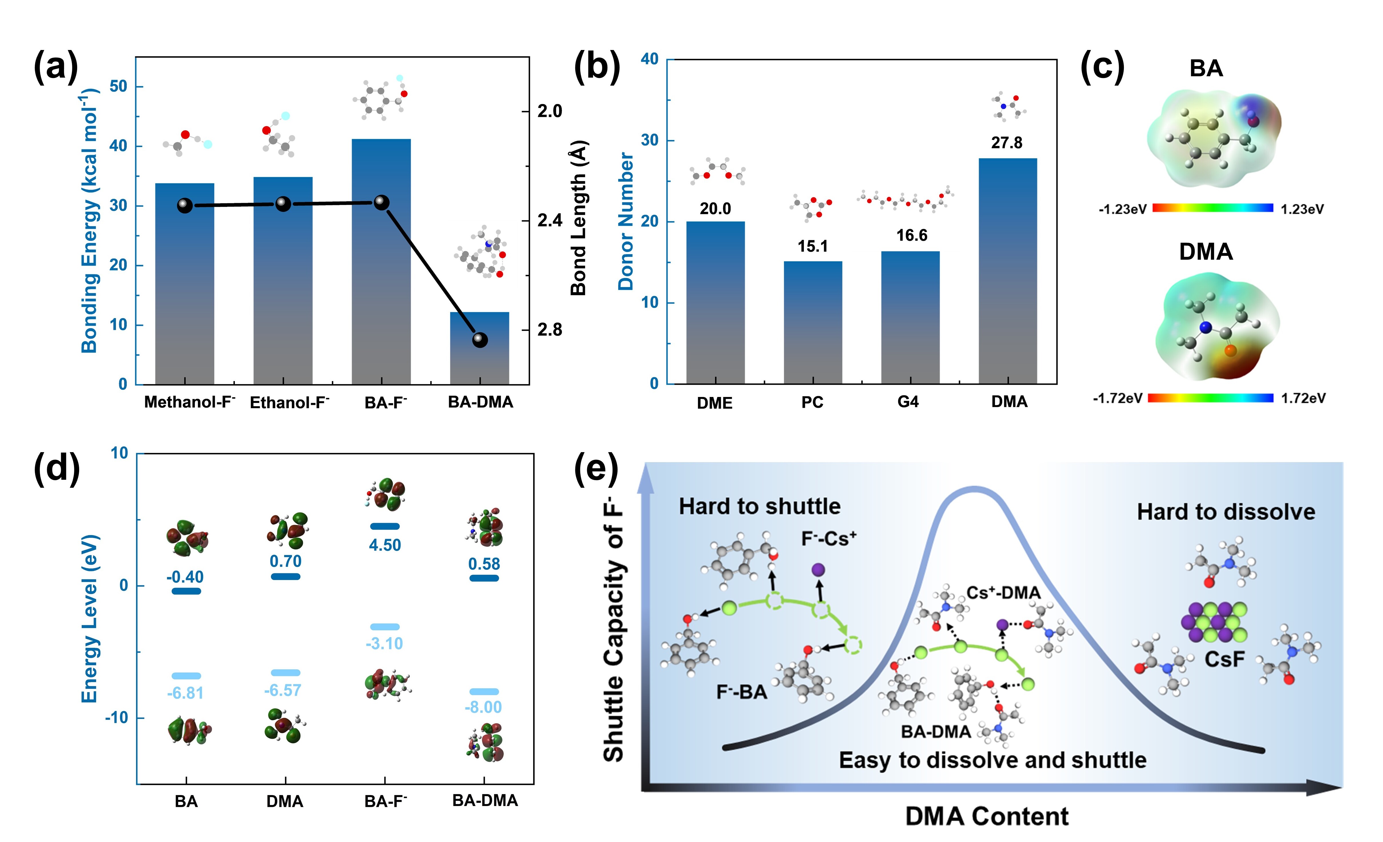该团队也通过在醇阴离子受体苯甲醇(BA)中引入 N, N-二甲基乙酰胺(DMA)作为高古特曼供体数(DN)溶剂,获得了可同时实现氟盐高效解离和活性物质穿梭抑制的高性能氟离子电池电解液。高供体DMA通过氢键作用有效调控了氟离子和铯离子的溶剂化构型,从而提高了氟离子在过量受体中穿梭和界面的脱溶剂化性能。同时,DMA能重新配置氢键网络,大大降低了游离BA的比例并提高了电解液的电化学稳定性。最后,高供体DMA 中富含电子的C=O基团能够将过渡金属阳离子稳定在电极界面,抑制活性物质(CuF2、PbF2)的持续溶解和穿梭。在BA和DMA的协同作用下,电解液的F-电导率和迁移数都显著提高。基于BA-DMA电解液的CuF2||Pb全电池可实现≈300 mAh g-1的可逆放电容量并稳定氟化/脱氟过程,43次循环后仍可实现245.5 mAh g-1的可逆容量。相关成果以“Electrolyte Design by Synergistic High-Donor Solvent and Alcohol Anion Acceptor for Reversible Fluoride Ion Batteries” 为题发表于Adv. Funct. Mater. 34, 2406421, 2024。