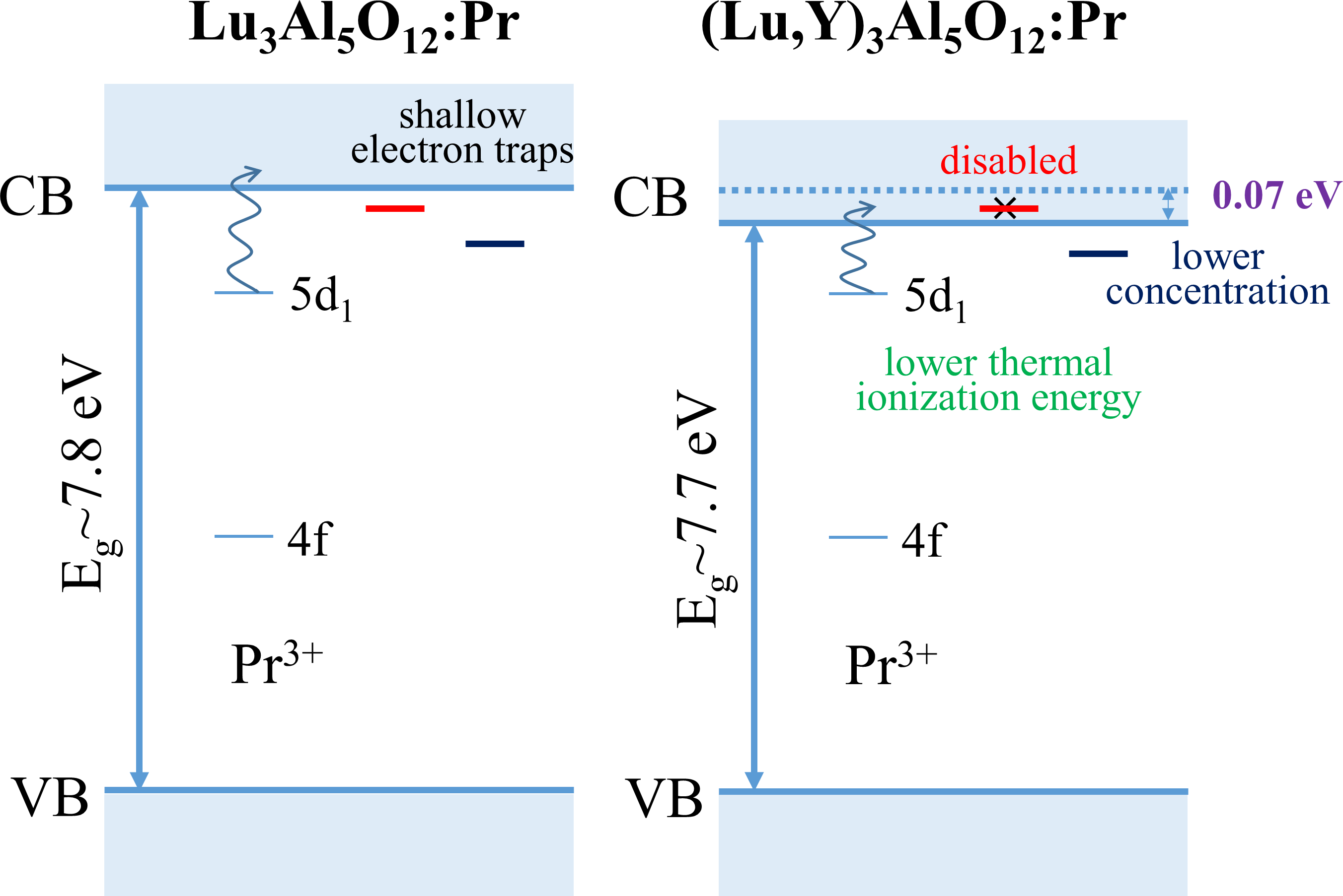 闪烁材料中的缺陷通过捕获输运过程中的载流子,延迟闪烁发光降低光产额,最终影响闪烁探测器性能。透明与光功能陶瓷研究团队通过采用第一性原理计算,低温热释光以及同步辐射等技术手段对材料中缺陷的存在形式和缺陷浓度进行表征。提出“能带工程”和“缺陷工程”共同作用的机制,并设计制备闪烁陶瓷材料LuYAG:Pr,成功抑制了材料中的浅能级缺陷,获得了材料综合闪烁性能提升,光产额达到24400ph/MeV。Y3+取代后不会在禁带中增加额外能级,而是导致禁带宽度减少,并使得材料中以反位缺陷为主的浅能级缺陷浓度下降。低温热释光表明,设计制备的材料中缺陷浓度大幅下降。光输出衰减动力学测试结果显示,材料中慢发光分量低于30%,光产额提高20%(Phys. Rev. Applied, 2016, 6: 064026)。