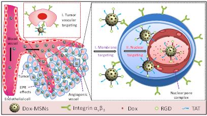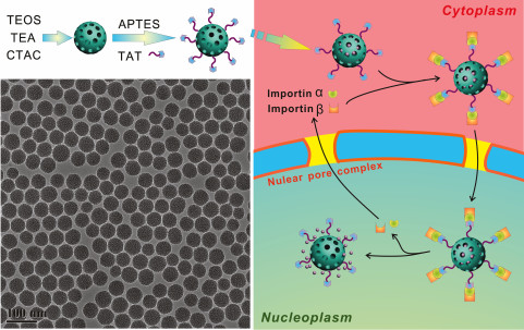 中国科学院上海硅酸盐研究所高性能陶瓷和超微结构国家重点实验室施剑林研究员带领的介孔与低维纳米材料课题组长期致力于开发高效抗肿瘤的新方法和新技术,在细胞核靶向介孔二氧化硅(MSNs)纳米药物输运体系研究领域积极探索,取得系列重要创新进展。相关研究成果发表于国际学术期刊《美国化学会志》、《先进材料》、《先进功能材料》、《生物材料》等。该研究团队针对传统纳米载药体系无法识别核孔复合体并有效穿越核孔(20-70 nm)这一缺陷,设计构建了具有细胞核靶向功能的超小介孔二氧化硅(25 nm)纳米载药体系。在细胞质中,该载药体系能智能识别核孔复合体,避免核孔复合体对外来异质结构的排外作用,从而穿越核膜,进入细胞核,将药物原位释放在细胞核靶点周围,进而显著提高抗癌药物的DNA损伤效果,大幅增强抗癌效果。该工作详细研究了无机纳米载药体系的细胞核靶向药物输运关键因素(粒径、核靶向配体、作用时间等),为临床实现高效低毒的化疗效果提供了新的给药方式。