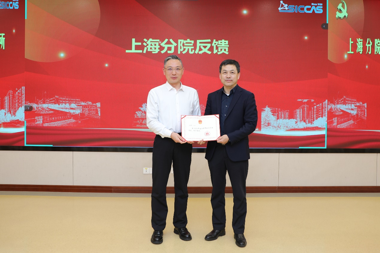 胡嘉代表上海分院分党组反馈领导班子及成员年度考核结果,并结合数据分析,提出了不足。上海硅酸盐所领导班子集体获中国科学院2024年度考核优秀嘉奖,上海硅酸盐所党委书记王东、所长苏良碧获评优秀,王华代表院党组为领导班子、王东、苏良碧颁发证书。