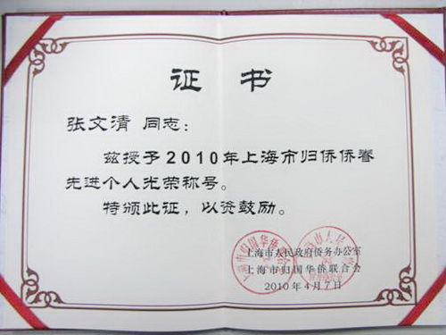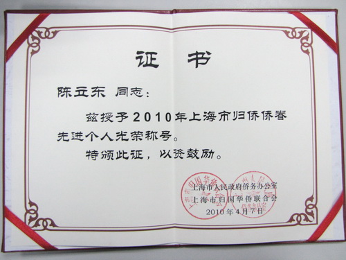 2010年4月7日下午,上海市第十次归侨侨眷代表大会开幕式在上海展览中心举行。中共中央政治局委员、上海市委书记俞正声出席,并为上海侨界“十杰”和归侨侨眷先进个人、上海侨联工作先进集体及先进个人颁奖。