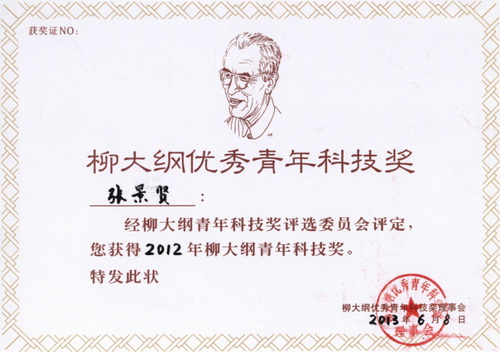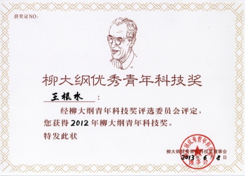6月8日,第六届“柳大纲优秀青年科技奖”颁奖仪式在中国科学院青海盐湖研究所学术报告厅举行,中国科学院院长白春礼和青海省副省长高云龙共同为获奖者颁发了获奖证书和奖杯。2012年度“柳大纲优秀青年科技奖”共有六位同志获得,中国科学院上海硅酸盐研究所张景贤研究员、王根水研究员获此殊荣。