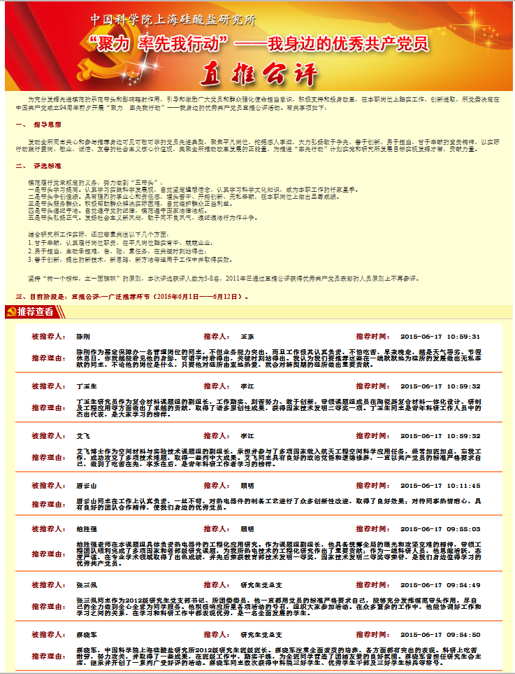 为引导和激励广大党员和群众强化使命担当意识,积极支持和投身改革,在本职岗位上踏实工作、创新进取,继2011年创先争优直推公评活动后,中国科学院上海硅酸盐研究所于中国共产党成立94周年前夕再次组织开展了“聚力•率先我行动”——我身边的优秀共产党员直推公评活动。活动聚焦平凡岗位,挖掘感人事迹,本着“树一个榜样,立一面旗帜”的原则,以带头学习提高,带头争创佳绩,带头服务群众,带头遵纪守法,带头弘扬正气“五带头”为评选标准,着重关注甘于奉献、善于创新、勇于担当三个方面,为期一个多月,历经了通知动员、网上实名推荐、网络公开投票和组织会评等评选环节。7月1日下午,中国科学院上海硅酸盐研究所隆重召开纪念建党94周年暨“聚力•率先我行动”主题活动推进大会,对评选出来的优秀共产党员进行了表彰,并通过视频和演讲的方式对优秀党员的事迹进行了宣传展示。
