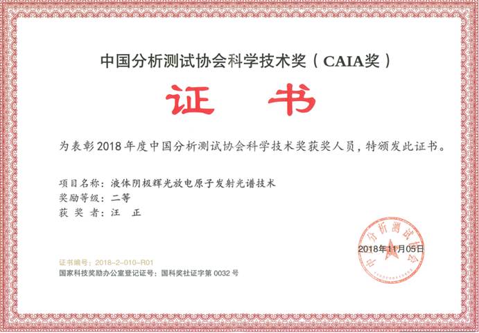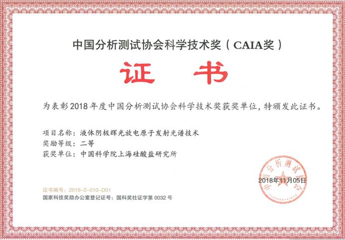 近日,中国分析测试协会公布了2018年中国分析测试协会科学技术奖(CAIA奖)获奖名单。由中国科学院上海硅酸盐研究所材料原子光谱分析课题组汪正研究员团队完成的研究成果“液体阴极辉光放电原子发射光谱技术”获2018年中国分析测试协会科学技术奖二等奖。