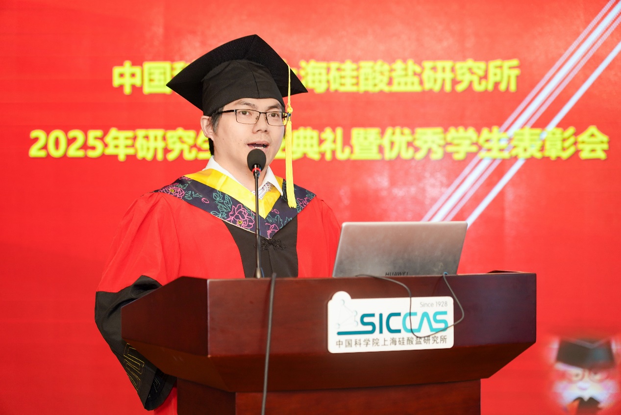 在读研究生代表钱源涛发言,向即将踏上人生新旅程的师兄师姐们送上最真挚的祝福。他表示,师兄师姐们的成绩不仅是个人的荣誉,更是硅所全体师生的骄傲。他祝愿师兄师姐们在未来的道路上,既有“仰天大笑出门去”的豪迈,也有“守得云开见月明”的定力,永远记得在硅所度过的这段珍贵时光,继续追逐自己的梦想。