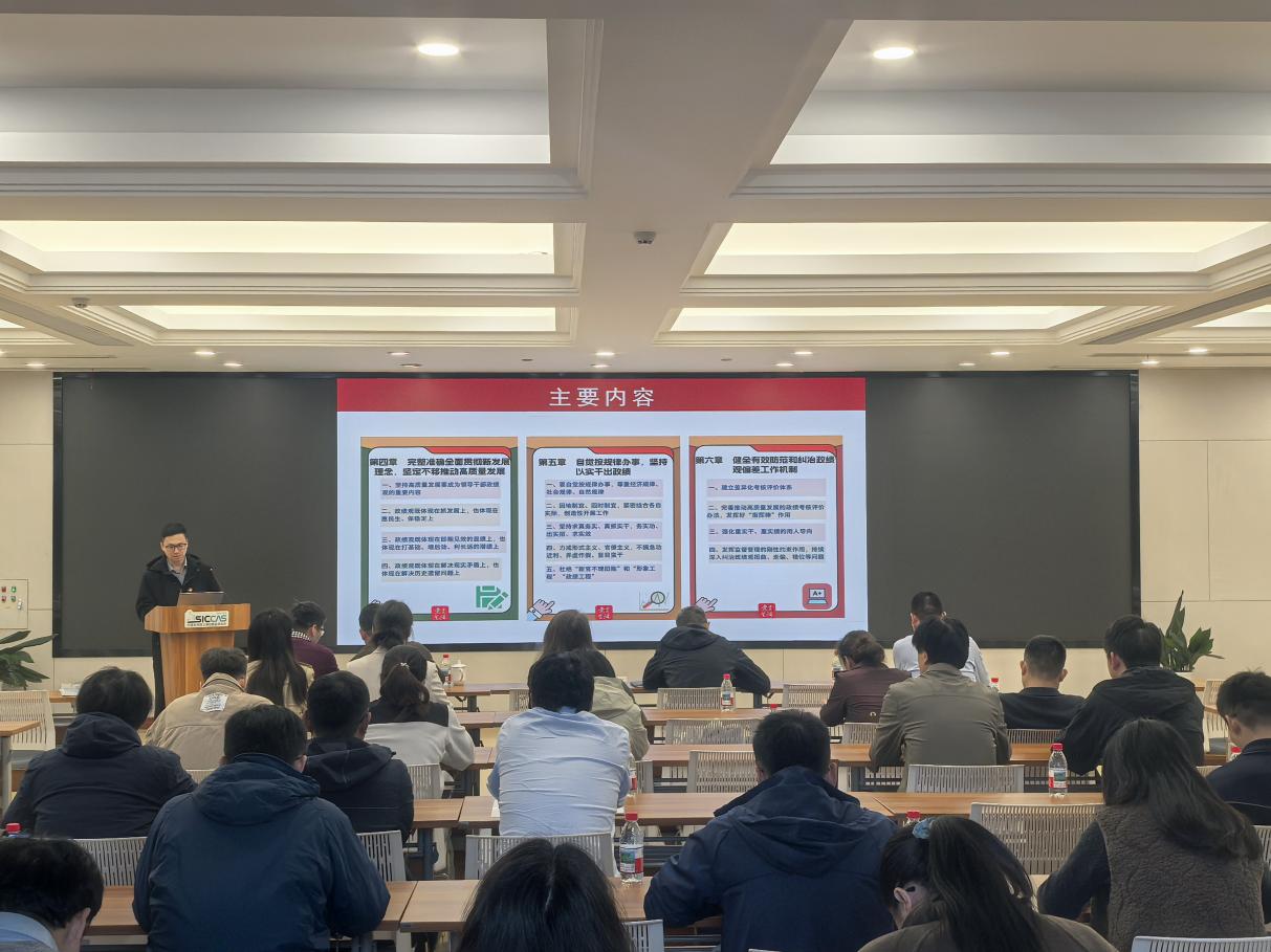 3月30日下午,中国科学院上海硅酸盐研究所信息功能材料与器件研究中心党支部开展“学精神、强党性、重实干、促攻坚”主题党日活动,深入学习贯彻习近平总书记关于树立和践行正确政绩观学习教育的重要讲话和重要指示精神、2026年全国两会精神和全国科技大会精神、中国科学院2026年度工作会议、冬季党组扩大会议精神。上海硅酸盐所党委书记王东,所务委员、科技发展部部长、发展规划处处长刘军,所务委员、信息功能中心副主任马名生,及支部全体党员和科研人员等参加活动。会议由中心党支部书记、副主任曾华荣主持。