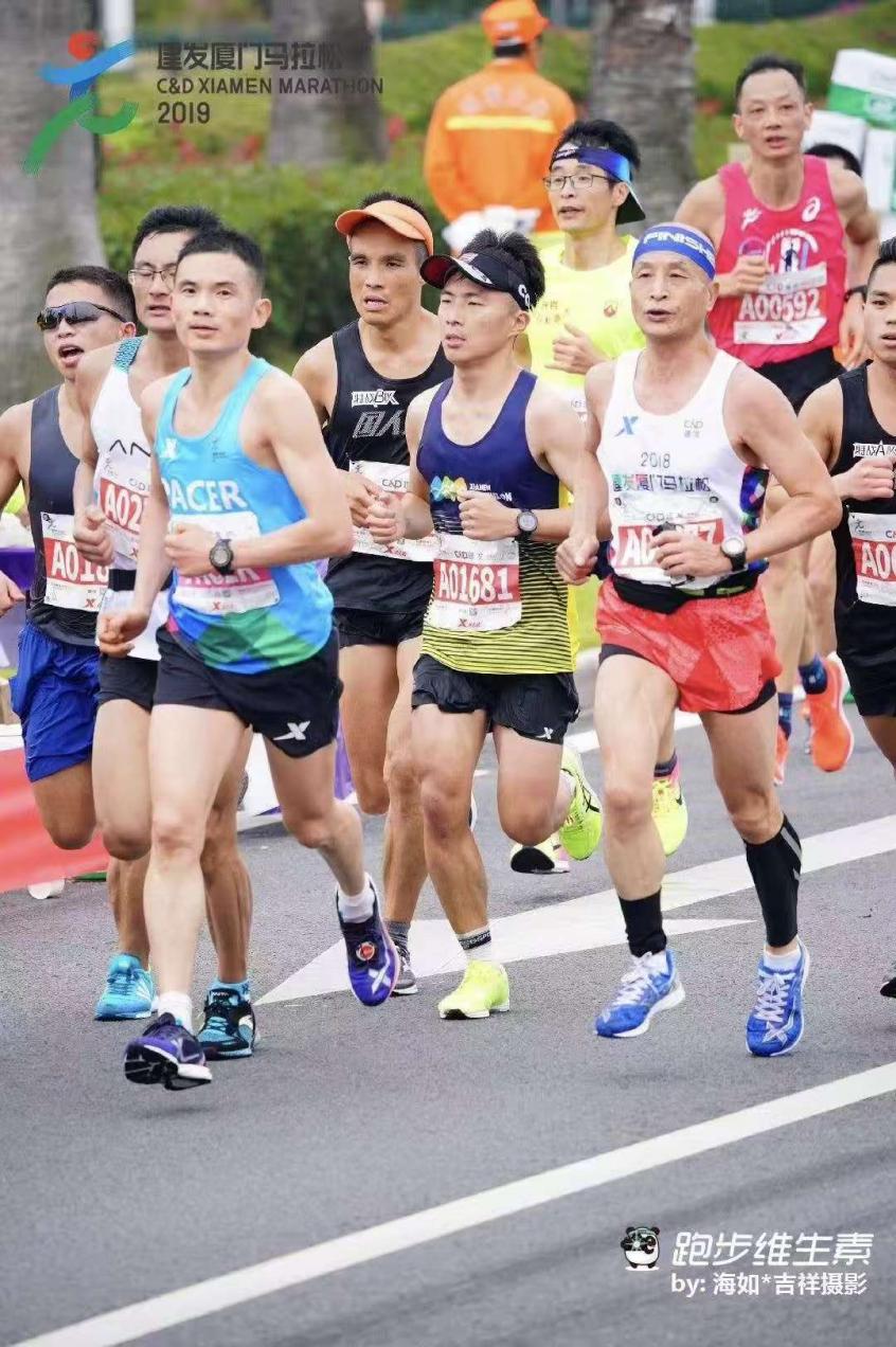 2019厦门马拉松,我如愿破三,在比赛途中留下一张珍贵的照片。这张照片中身着白色背心的老者是时年68岁上海著名跑者黄财富,这场比赛中他以2:59的成绩破三,刷新了当时由他自己保持的65岁以上年龄段全国记录。