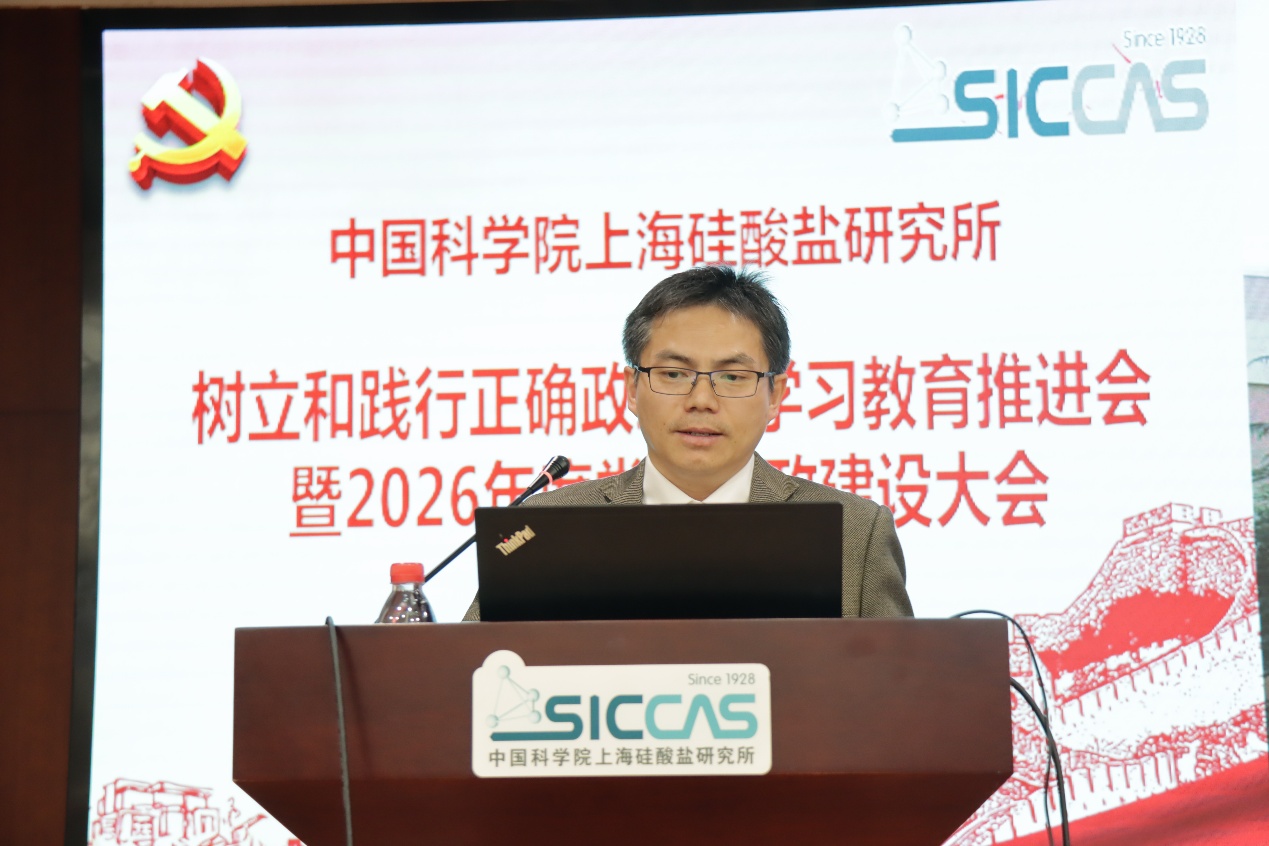 党委书记王东作题为“树立和践行正确政绩观,以实干实绩抢占科技制高点”的学习教育专题报告,领学了习近平总书记关于树立和践行正确政绩观的重要论述以及正确政绩观的核心内涵,传达了中央、院党组和所党委关于开展树立和践行正确政绩观学习教育的工作要求,以及上海硅酸盐所部署开展学习教育的工作进展,介绍了科技领域聚焦科技自立自强、树立和践行正确政绩观的正面典范、反面警示案例。纪委书记、党委委员周田华作题为“树牢正确政绩观 护航高质量发展”的党风廉政建设专题报告。报告总结了研究所过去一年党风廉政建设工作取得的成效,传达中央和院党组关于全面从严治党和党风廉政建设的工作要求,部署了2026年党风廉政建设重点工作任务,有针对性地剖析了典型案例,提醒广大职工要通过不断学习,深刻领会党中央和院党组重要部署和工作要求,要以案为鉴,时刻保持警钟长鸣,以优良的作风学风保障重大任务顺利实施。